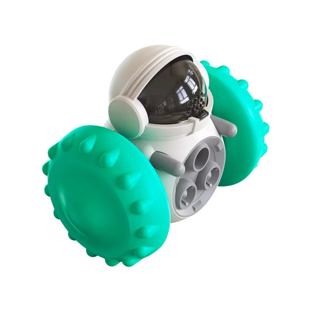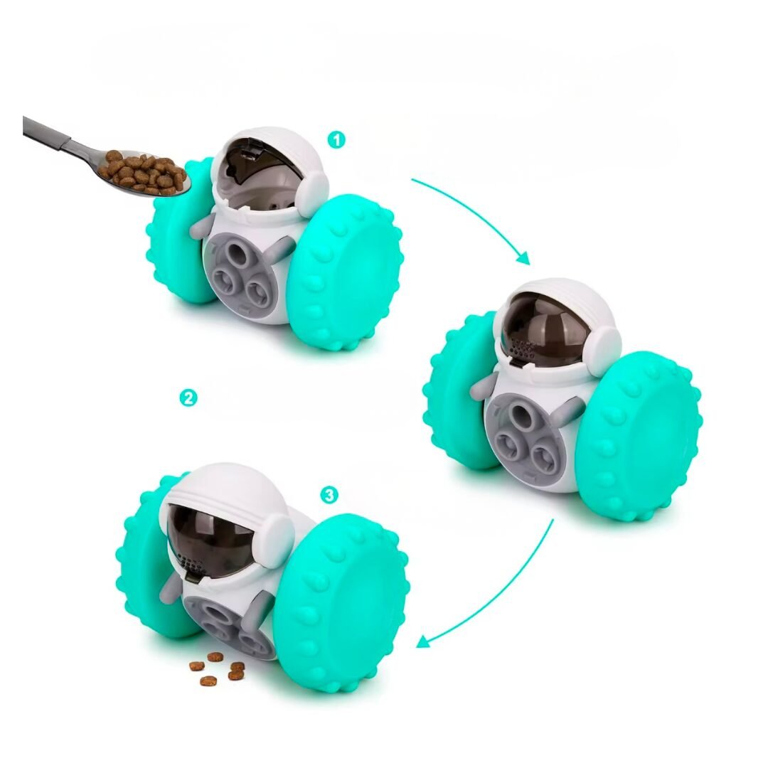 El sistema de contrapeso interno hace que el robot se tambalee ligeramente al moverse, lo que aumenta el interés del perro y estimula su instinto de persecución. A medida que el robot avanza, pequeños orificios estratégicamente ubicados liberan las galletas de forma intermitente, recompensando al perro por seguirlo o interactuar con él.